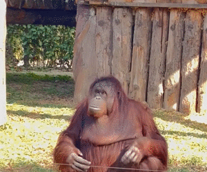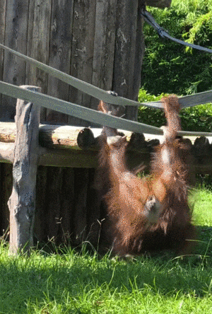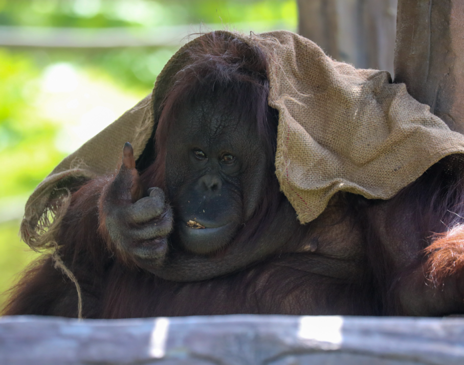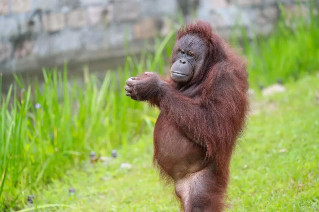 作为灵长目人科动物,红毛猩猩具备复杂的学习能力和模仿能力。在与人类长期相处中,它们不仅理解人类的行为信号,还能模仿甚至自己“开发”出许多互动动作。吃饱喝足的四毛,还是位专业“营业猩”,会对着保育员和游客秀出各种互动小动作:飞吻、举手、抱抱,甚至还会模仿人类鼓掌、比心,这些可爱的动作不仅是对保育员情感的传递,也是红毛猩猩高智商的表现。