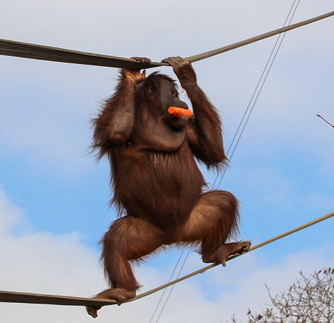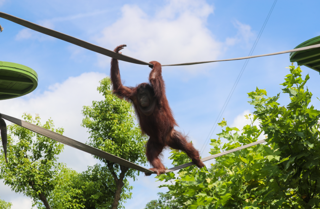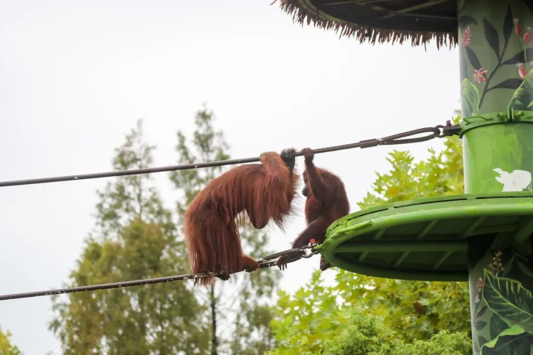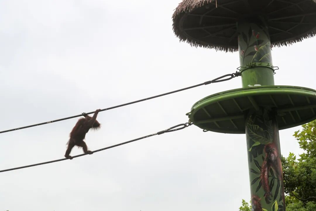 四毛和壮壮是园区创新推出的“猩空漫步”行为展示项目的重要主角。数米长的高空索道上,四毛能凭借天生的身体优势,手脚并用在索道上从容穿梭,动作灵活自如。